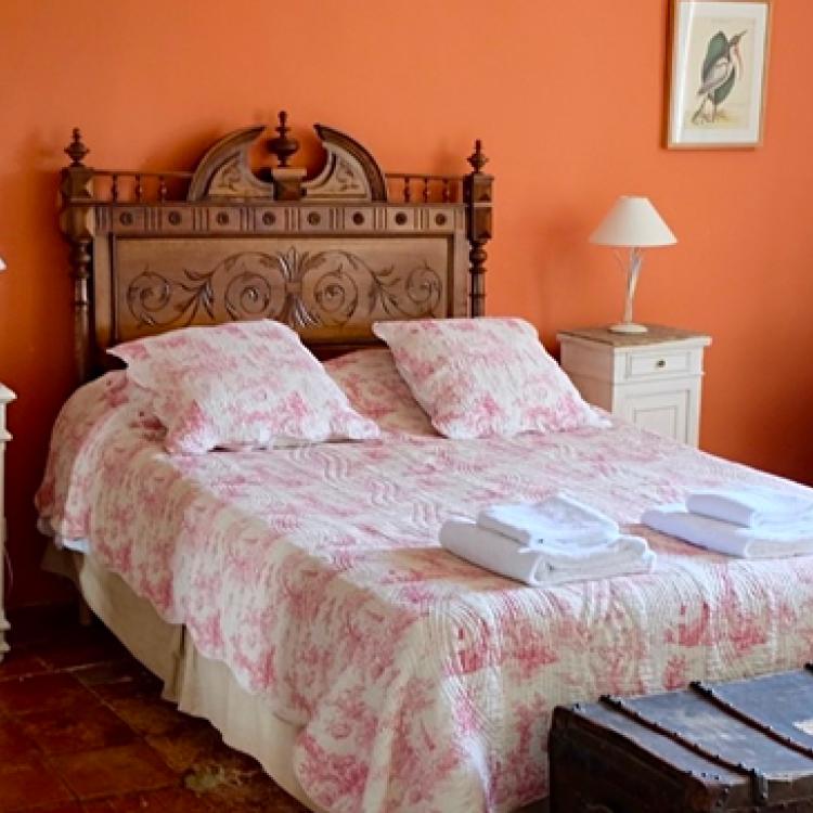 Is left at the top of the stairs in the Wellington Wing. The queen-sized bed has a lovely antique Lauragais headboard, the floor is the original tiled terracotta, and you can put all your frocks in a handsome Provencal armoire.